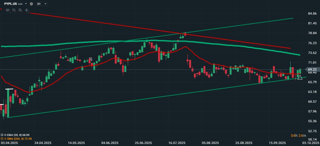 PYPL mantiene una estructura de tendencia alcista, con el precio actualmente situado en la parte inferior del canal de subida y cerca de la media móvil de 20 periodos. Existe una alta probabilidad de recuperación del precio en los próximos días, por lo que se considera una buena oportunidad de compra con take profit en 75.46, nivel de resistencia previo, y stop loss en 66.78, por debajo de la línea de tendencia.